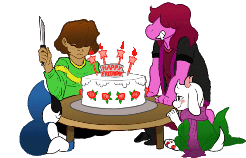 Deltarune characters Kris, Susie, Ralsei, and Lancer gather around a 'Happy Friends' cake with a knife.