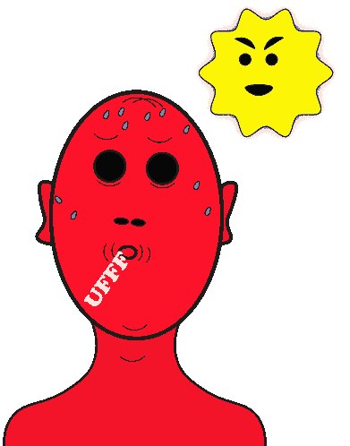 A red, sweating figure expresses 'UFFF' under an angry sun, perfectly capturing the feeling of intense summer heat.
