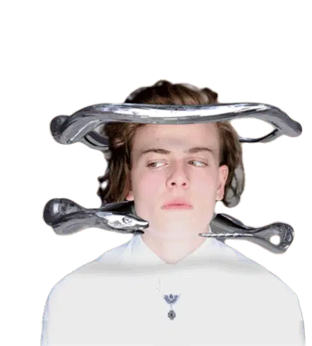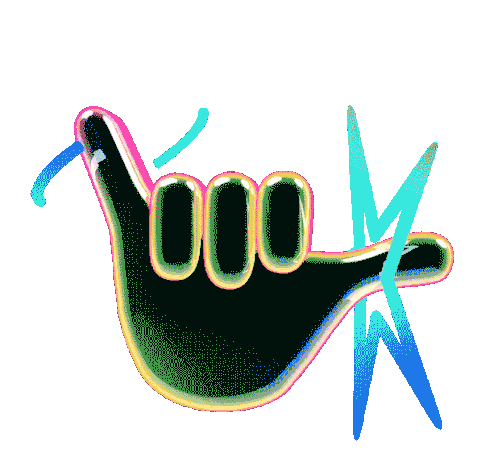 An animated emoji hand making the "Call Me" or "Shaka" gesture, outlined in vibrant neon colors with a geometric background.