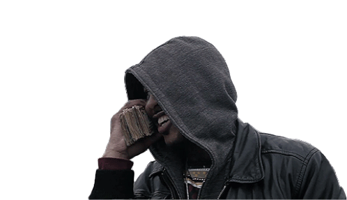 Mariel Semonte Orr smiles while holding a large stack of cash to his ear, pretending it's a phone. He's flexing his money.