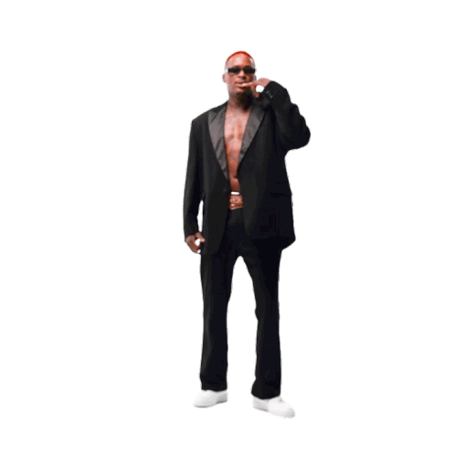 Rapper YG in a stylish black tuxedo jacket and pants, striking a cool pose with his hand near his mouth.