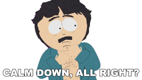 Randy Marsh from South Park, with an open shirt, gestures while saying "Calm Down, All Right?".