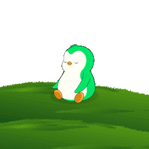 A cute green and white cartoon penguin sits peacefully on lush green grass, eyes closed in a state of calm meditation.