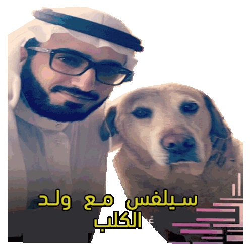 A man takes a selfie with his dog, featuring an Arabic caption that translates to 'Selfie with the dog'.