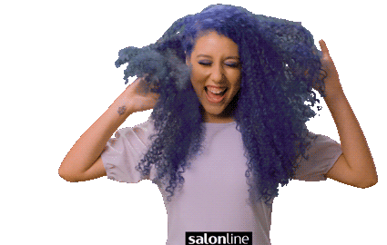 Camily Barros joyfully shakes her vibrant purple curly hair, showcasing its volume and bounce with a big smile.