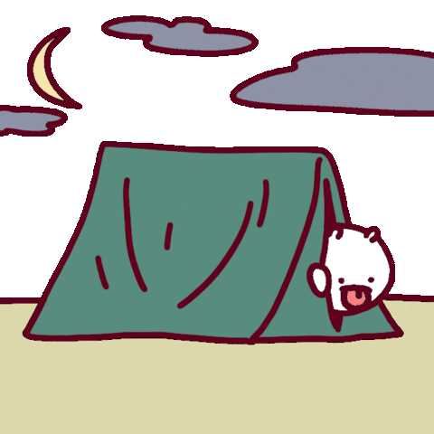 A cute cartoon pig peeks out of a green tent under a crescent moon and clouds, enjoying a night of camping.
