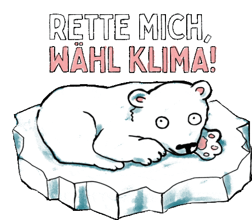 A cartoon polar bear on a melting ice floe pleads 'SAVE ME, VOTE CLIMATE!' for the Campact Klimawahl2021 campaign.