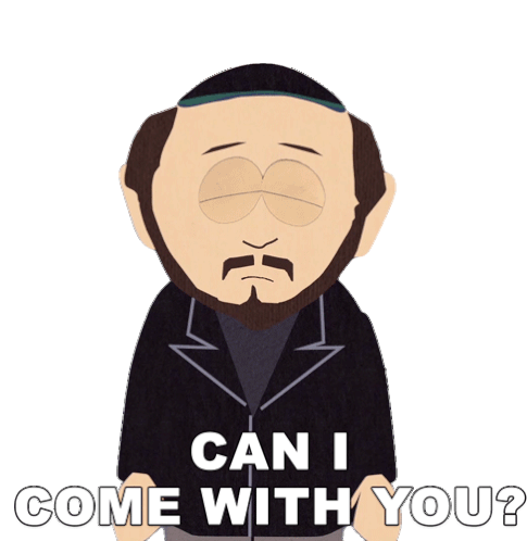 Gerald Broflovski from South Park, with a beard and yarmulke, asks, 'Can I come with you?'