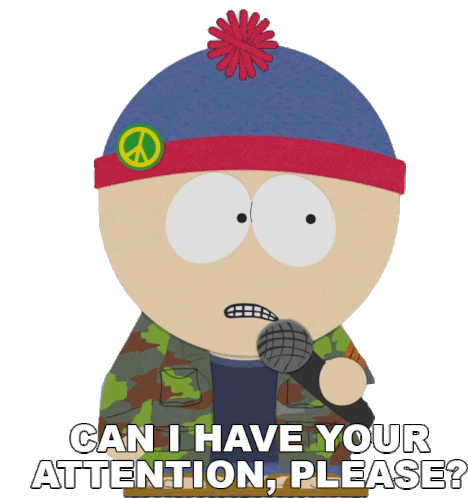 Stan Marsh from South Park asks for attention with a microphone, saying 'Can I Have Your Attention, Please?'