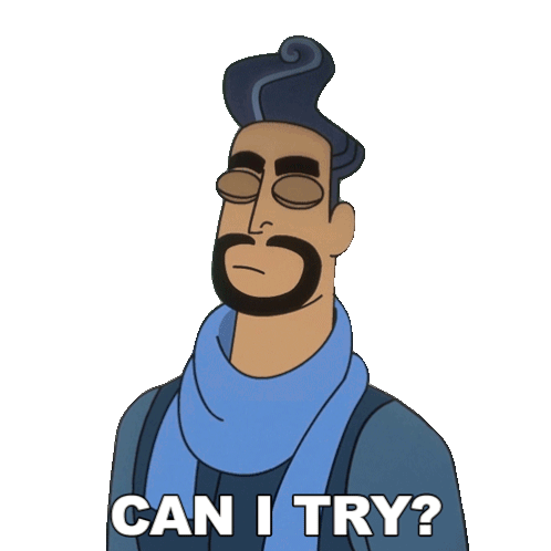 Zane Troy from Digman! with a confident smile, asking 'Can I try?' This animated sticker is perfect for offering help or expressing eagerness.