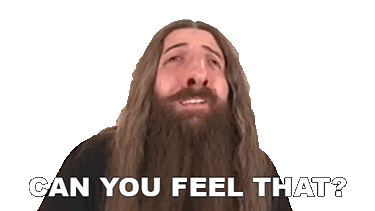 Samus Paulicelli, with long hair and a beard, looks up expressively, asking 'Can you feel that?'