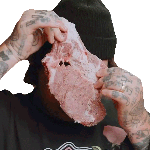 Matty Matheson playfully holds a large, seasoned pork chop in front of his face, asking "Can you see me?"