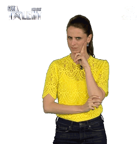 A woman from Canal10uy's Got Talent Uruguay is shown with a thoughtful, puzzled expression, finger on her chin.