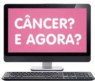Sticker com a pergunta 'Câncer? E Agora?' em um monitor, transmitindo uma mensagem de reflexão e apoio.