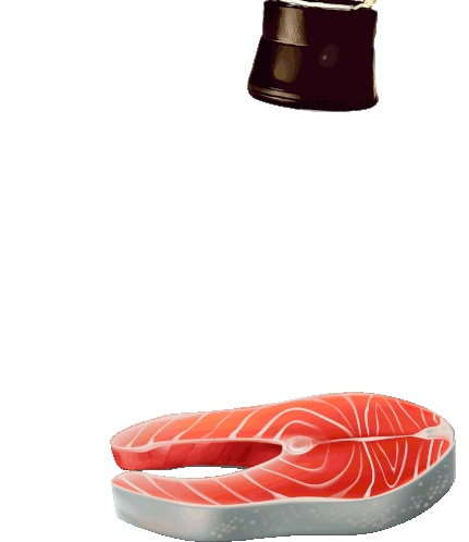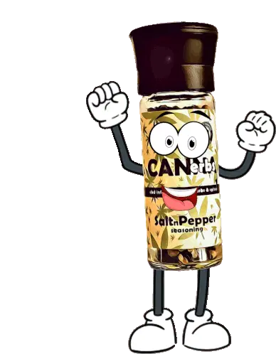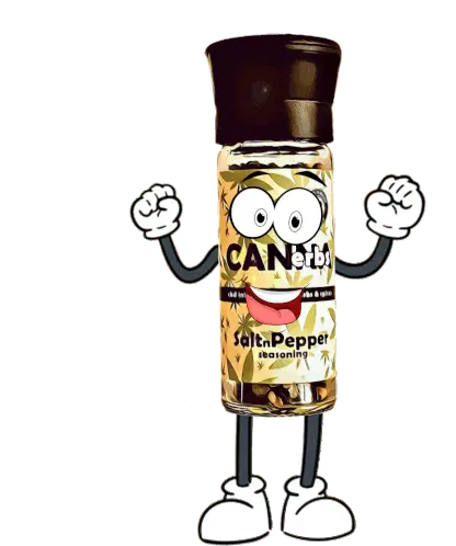 A fun Cannaerbs CBD seasoning grinder character sprinkles colorful spices onto a fresh salmon steak.