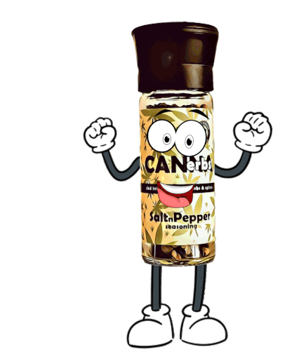 An animated Cannaerbs CBD seasoning bottle character with arms and legs, cheering as seasoning sprinkles.