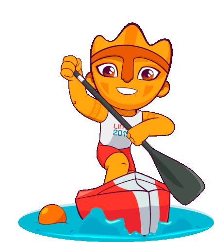 Milco, the Lima 2019 Pan American Games mascot, happily paddles a canoe in a sprint event, showcasing energy and joy.