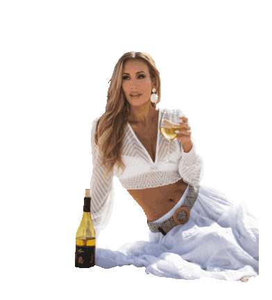 Leah Van Dale (Carmella) relaxes with a glass of wine and a bottle of Capo Cagna, enjoying a moment of leisure.