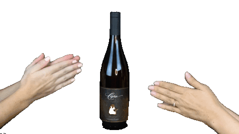 Hands clap enthusiastically around a bottle of Capo Cagna wine, celebrating a good drink or event.