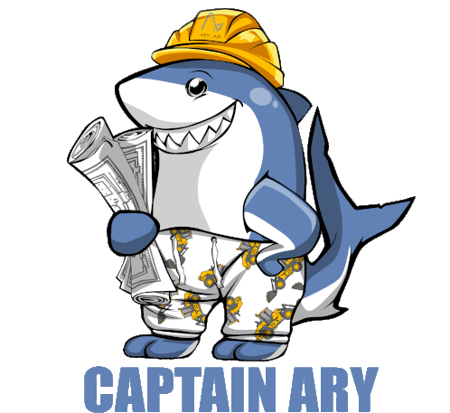 Captain Ary, a friendly shark, wears a hard hat and construction shorts while holding blueprints.