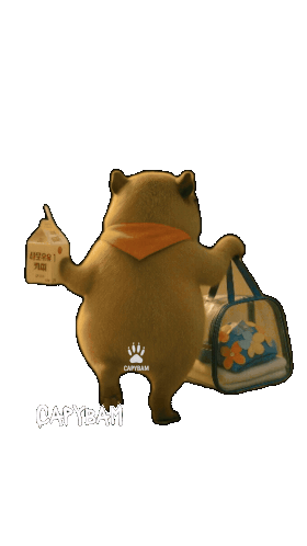 a picture of a bear holding a bag and a box that says ' cary bam ' on the bottom