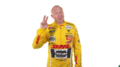 Tom Coronel, a racing driver in a yellow DHL jacket, smiles and gives a peace sign.