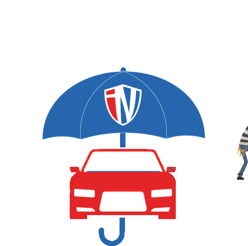A red car is protected by a blue umbrella from a falling branch and a burglar, symbolizing comprehensive insurance coverage.