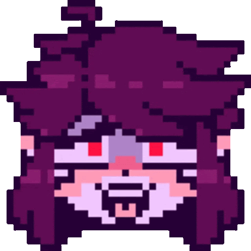 a pixel art of a person 's face with purple hair and red eyes .