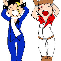 Wellingarde characters perform the Caramelldansen, a joyful pixel art animation of two figures cheering with hands up.