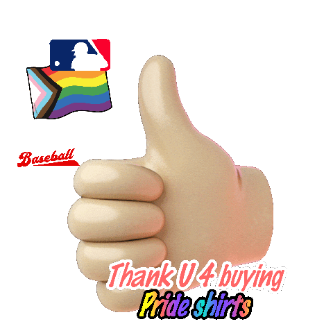 A thumbs up emoji with sparkles thanks viewers for buying Pride baseball shirts, featuring an MLB logo and Pride flag.