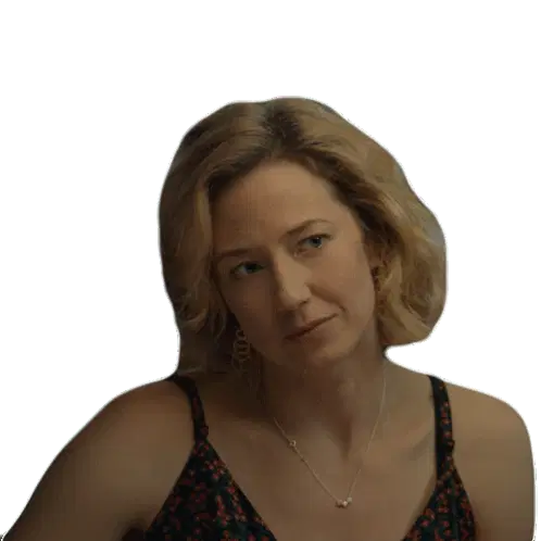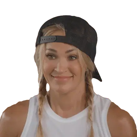 Carrie from Zoophobia, a character with long blonde hair and a skeletal face, blinks while wearing a cowboy hat and bandana.
