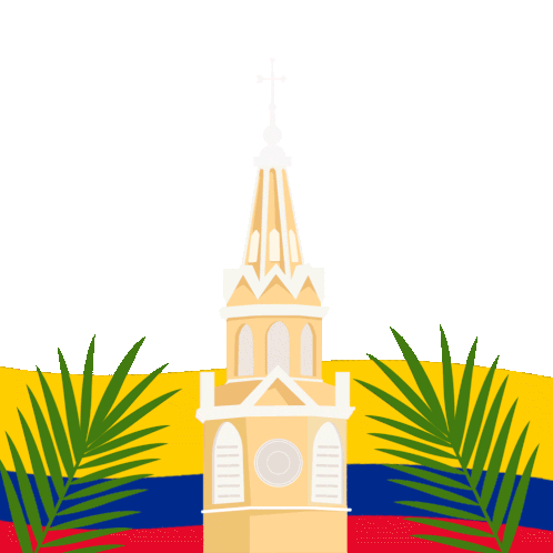 Celebrate Cartagena Independence Day with this animated sticker featuring a church steeple, palm fronds, and the Colombian flag.