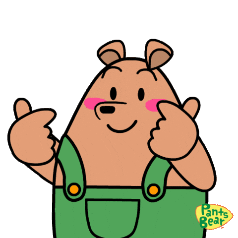 Pants Bear, a cute cartoon character in green overalls, makes a double finger heart gesture, expressing love and affection.