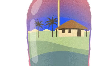 Animated cartoon island scene inside a sand bottle, featuring palm trees, a hut, and a sky changing colors.