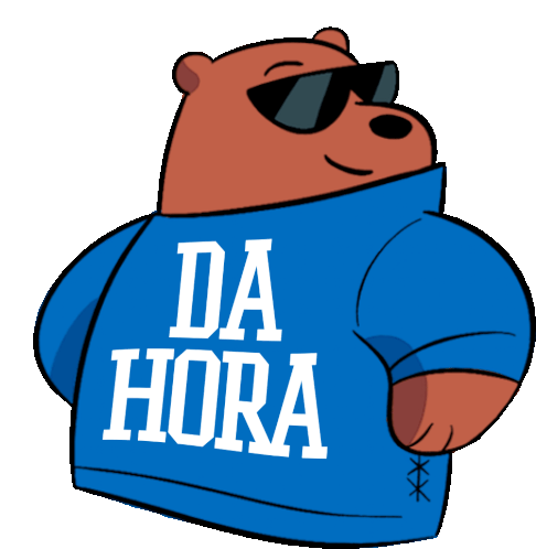 Grizzly from We Bare Bears, wearing sunglasses and a blue jacket with 'DA HORA' (Cool) written on it, looking confident and stylish.