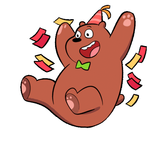 Grizzly from We Bare Bears celebrates Friday with confetti, wearing a party hat and a green bow tie.