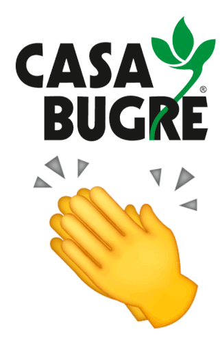 Animated sticker featuring the Casa Bugre logo with green leaves, accompanied by an emoji of clapping hands.
