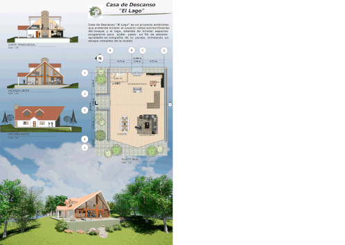 Architectural plans and renderings for 'Casa De Descanso El Lago,' a modern rest house designed for forest and lake views.