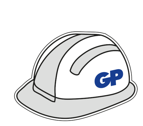 A white hard hat with a blue 'GP' logo, symbolizing safety and construction work.