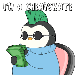 A cool penguin with a green mohawk and sunglasses proudly displays stacks of cash, declaring 'I'M A CHEAPSKATE'.