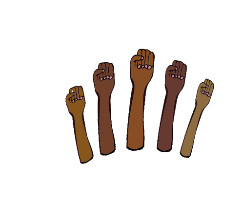 Multiple fists of varying skin tones are raised in the air, symbolizing freedom and solidarity, often associated with Juneteenth.