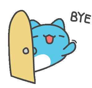 A cute blue cartoon cat peeks from behind a yellow door, waving goodbye with a cheerful expression.