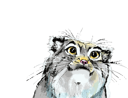 A charming animated sticker featuring a stylized Pallas's cat (Manul) face, looking up with wide, expressive eyes.