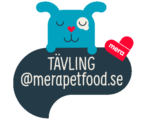 A cute blue cartoon dog with a heart nose peeks over a speech bubble announcing a Mera Petfood competition.