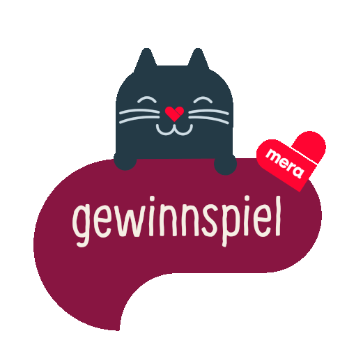 A cute black cat with a heart nose peeks over a purple speech bubble featuring "gewinnspiel" and the "mera" brand.