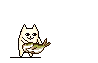A pixel art cat holds a fish, then lifts it overhead before a vibrant purple explosion erupts.