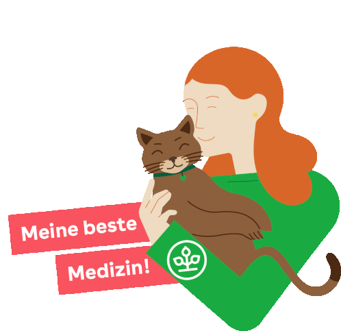 Eine glückliche Frau hält eine braune Katze, mit dem Text "Meine beste Medizin!". Zeigt Liebe und Trost.