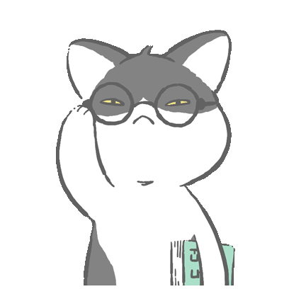 A cute gray and white cartoon cat wearing glasses, holding a book, and appearing thoughtful or studious.
