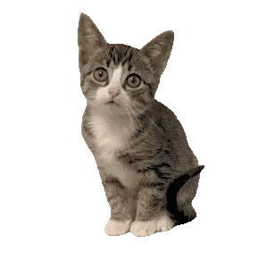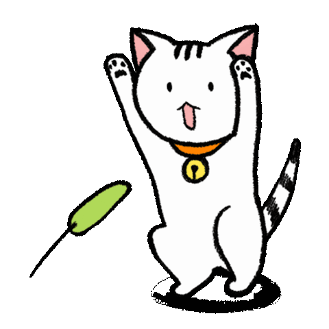 A cute white cartoon cat with stripes and a bell collar stands on its hind legs, playfully reaching up for a green toy.