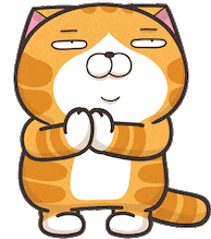 A cute orange and white Lan Lan Cat character stands with its paws together in a bowing or praying gesture, looking pleased.